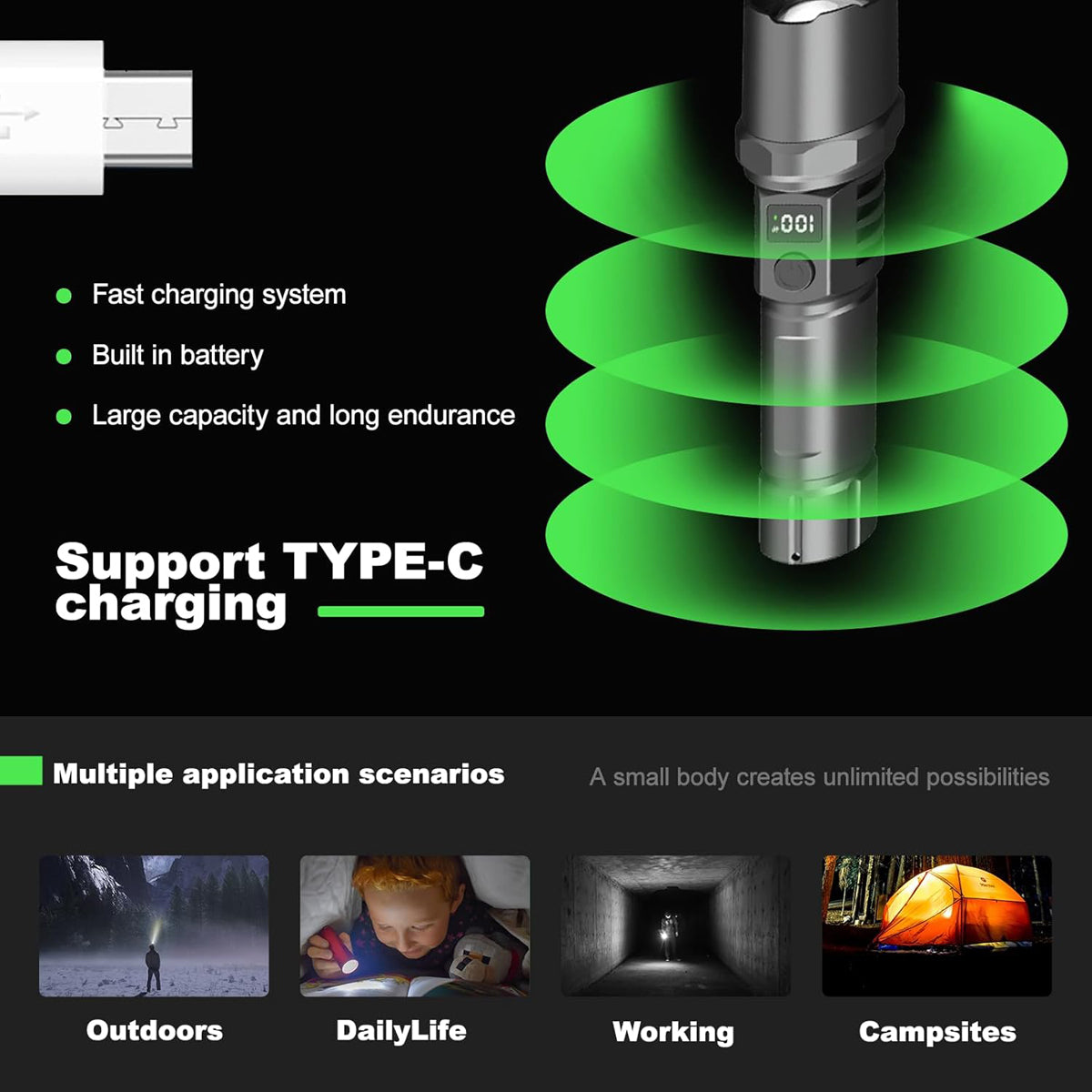 Illuminate your world with our Versatile Tactical LED Flashlight! Offering powerful, focused lighting with multiple brightness modes, it’s perfect for construction sites, stadiums, and outdoor adventures. Designed for durability and weather resistance, this energy-efficient flashlight ensures reliable performance anywhere. The intuitive digital battery display and easy button control make mode selection a breeze. Plus, its rechargeable battery delivers long-lasting power.