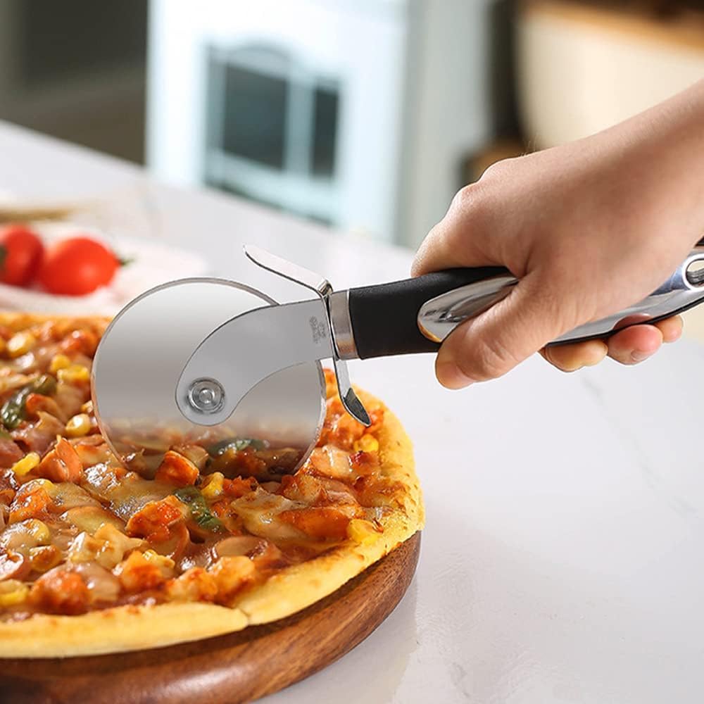 Daily used pizza cutter, this pizza cutter set includes a sharp wheeled pizza cutter and a triangular server gadget. This stainless steel pizza cutter kit are perfect for making pizza, pies, sandwiches, pastry, cake, dough, etc. They are the good helper in the kitchen, make cutting more labor-saving ! Stainless steel cutter like no other plastic cutter, it will do no harm to body health when cutting the pizza. Large area on the handle for logo imprint. If you are interested in including your company's logo, brand name or information on it, please contact me and I will give you a satisfactory solution !