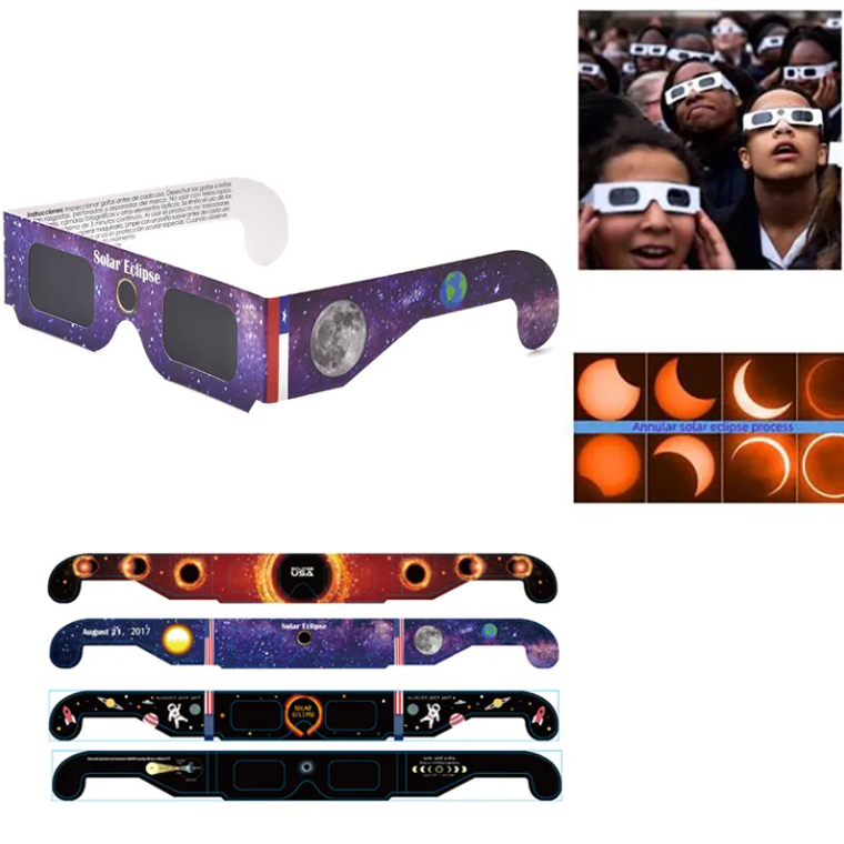 Dies ist die sichere Sonnenfinsternisbrille, die Sie suchen! Unsere Sonnenfinsternisbrille wurde nach dem aktuellsten Standard ISO 12312-2:2015 für Filter zur direkten Beobachtung der Sonne getestet. Die Filteroberfläche ist mit kratzfestem Silberpolymer beschichtet, das ein scharfes orangefarbenes Bild der Sonne erzeugt und 100 % Ultraviolett- und Infrarotlicht sowie 99 % intensives sichtbares Licht herausfiltern kann! Sie können die totale Sonnenfinsternis mit absoluter Sicherheit in Bezug auf die Sicherheit Ihrer Augen beobachten! Schnelle Produktion in 5-7 Tagen, KEINE EINRICHTUNGSGEBÜHREN und VERSANDKOSTEN.