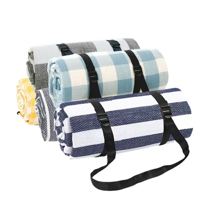 The picnic mat is composed of three layers of thickened structure. The top is solid and skin-friendly polyester fiber, the middle is a soft pad, and the back is waterproof Oxford cloth. The thickened design and four weight pockets (which can be filled with sand or stone) will keep our picnic mat windproof, which also provides you with additional sitting comfort.Thanks to its water-resistant bottom, the large picnic blanket is completely waterproof and sand-free, which will keep you from ground moisture or beach dampness, and protect you from sand, mud, wet grass, or even dirty campgrounds. Say goodbye to all that annoying sand/grass that sticks to your regular picnic blankets.