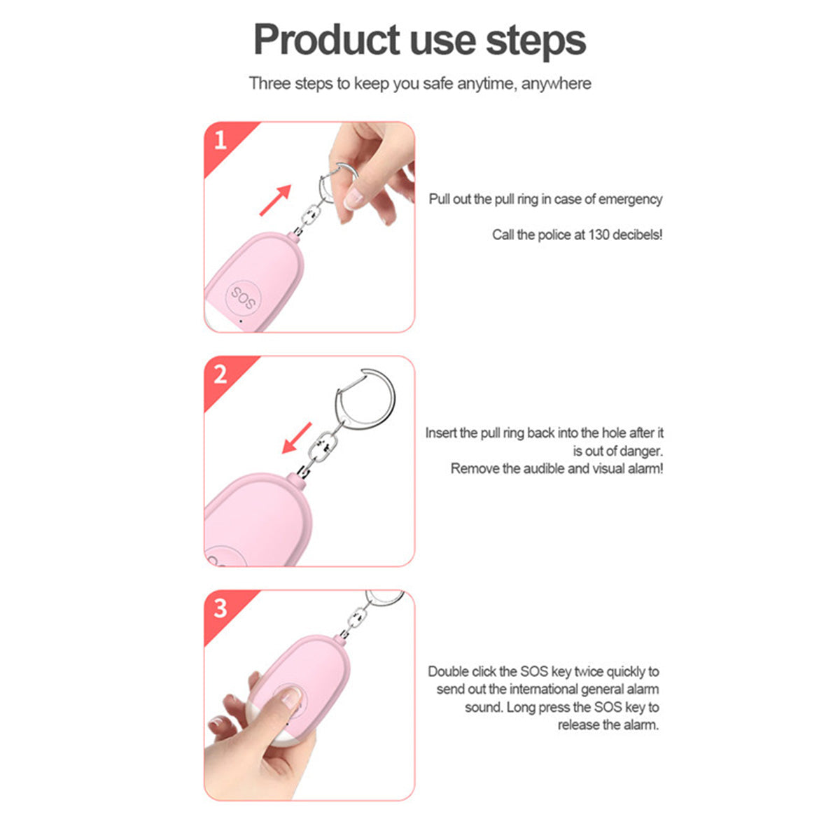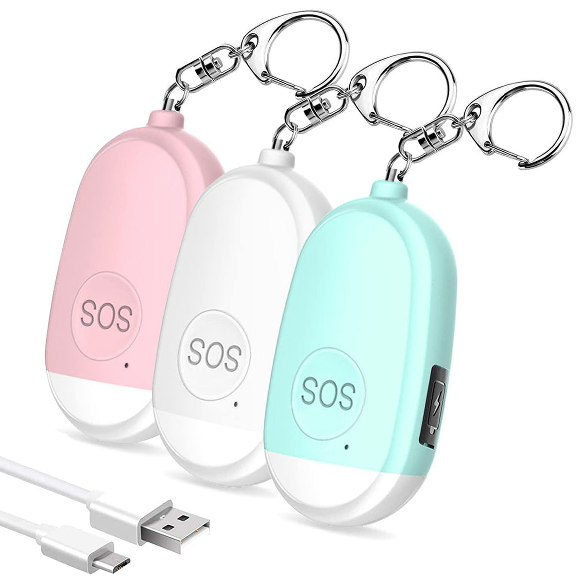 Personal alarm siren is Made of rechargeable lithium battery, not button battery. Do not need to replace the battery, directly use the usb data cable to charge and charge time is only 30 minutes.Up to 50 mins of continuous sound to ensure emergency use. It will replace self defense weapons to protect your safety, as pepper spray.You can pull the contact pin out or press the switch 2 times quickly, to activate alarm.Lightweightand portable Alarm Keychain: Self defense alarm can be attached to purse, backpack, keys, belt loops, and suitcases. It also can be brought onboard a plane, really convenient, fit for students, joggers, elders, kids, women, night workers.