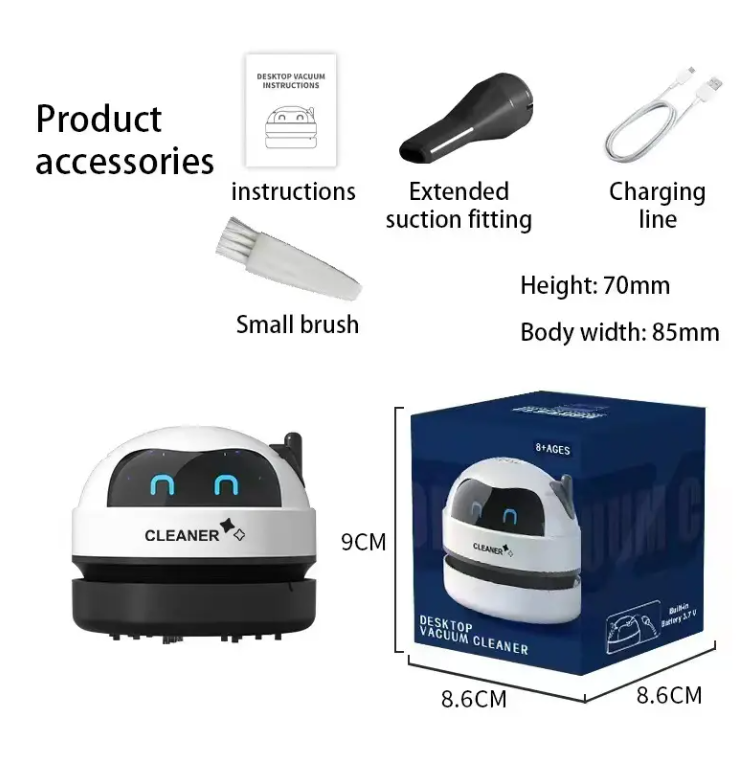 It comes with a long vacuum nozzle and strong suction. The small tabletop vacuum can easily clean small dust or crumbs at corners that are difficult to reach, according to your needs. You can easily clean the dust from the desktop, computer, keyboard, etc. Our desk vacuum is specially equipped with a USB charging cable; you can charge anywhere, only need to charge for 2-3 hours, and can continuously work for up to 3-4 hours. This is a small desktop dust sweeper, but the suction power is strong enough to sweep up a lot of accumulation. There is no noise operation, and it won't bother other people working.
