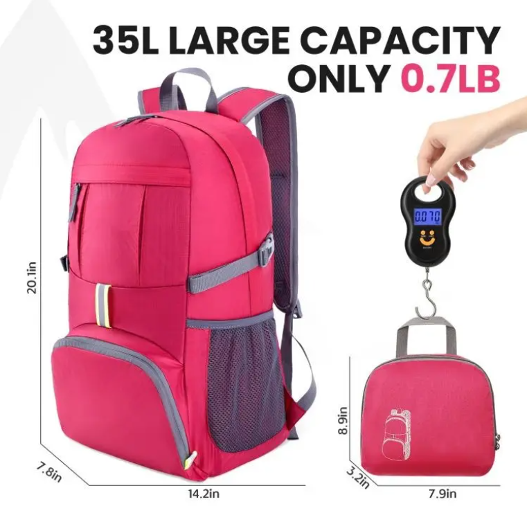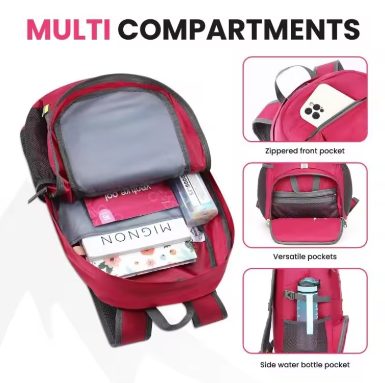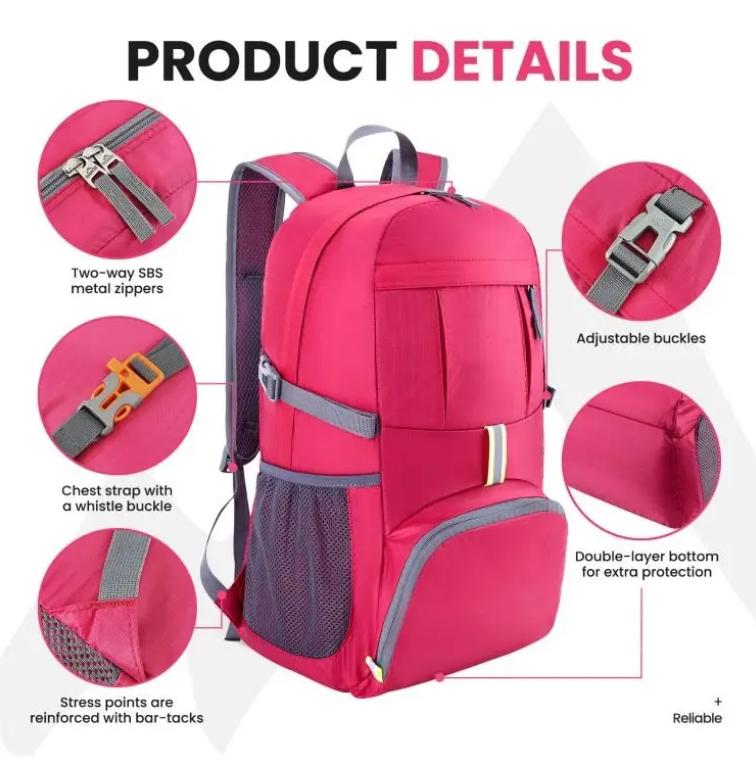 This lightweight hiking day pack is made of water-resistant material and has a zipper. Effectively prevent rainwater from wetting the phone, cash, and other items in the backpack. Tear-resistant nylon will effectively prevent branches and stones from scratching the pack, and keys and other products can also be safely placed inside. All stitches are strengthened for long-term use. This backpack features one main zipped compartment, two zipped front pockets, and two side pockets. The main compartment provides enough room, no matter if it's a day trip or a week-long journey. The two front pockets are good for holding small accessories and for easy access. Two side pockets are good for holding water bottles and umbrellas.